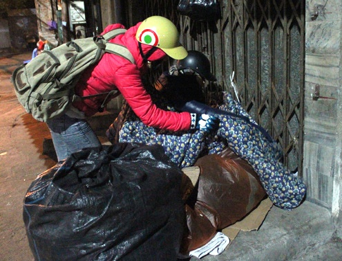 Các tình nguyện viên nhẹ nhàng đắp thêm chăn ấm cho bà lão nằm co ro trong áo mưa trên vỉa hè chợ Đồng Xuân.