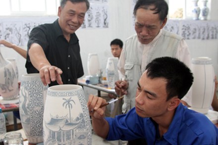 Ông Nguyễn Mạnh Cường (trái, áo đen), người đã cai nghiện thành công và xin ở lại Trung tâm hướng dẫn các học viên làm gốm xuất khẩu. Ảnh: Chí Tùng