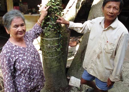 Vợ chồng bà Chanh bên cây thuốc ráng đồng tiền mọc đã 20 năm nay, giúp gia đình bà chữa trị cho nhiều người bị rắn cắn
