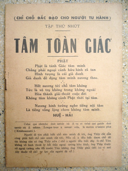 Ban Biên Tập Ánh Nhiên Đăng xin trân trọng giới thiệu dịch phẩm đặc sắc TÂM TOÀN GIÁC của đức Thầy Giác Lý đến quý đọc giả gần xa. Sách này đức Thầy tuyển dịch từ những bài thuyết giảng của ngài Krishnamurti bên trời Âu trong thế kỷ XX. Sách tuy chỉ có 20 trang giấy khổ A5 nhưng nội dung phong phú và sâu sắc, chứng tỏ dịch giả đã kinh nghiệm về Bát-nhã Ba-la-mật mới có thể hiểu và diễn đạt được như thế!