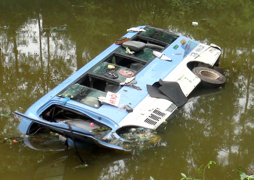 Hiện trường chiếc xe chở 31 hành khách lao xuống sông.