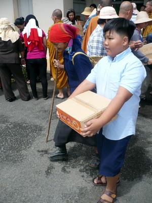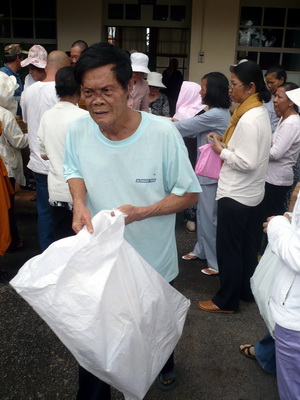 Một bác vừa lãnh quà xong - bé Trường mang quà giúp bà cụ
