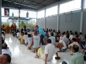Tại Trại Trọng Đức I, 200 bệnh nhân nam đang ngồi để nhận quà