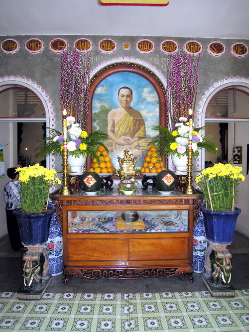 Bàn thờ Tổ sư, trong tủ là y bát tượng trưng