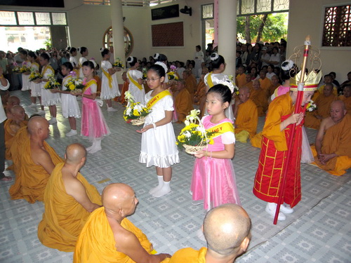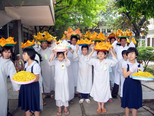 Các em dâng hoa cúng dường - 1 bé giả làm Mục-kiền-liên