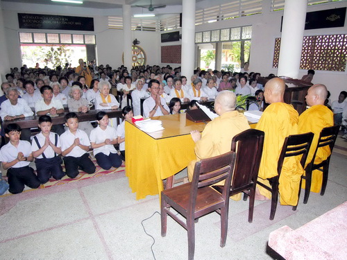 Chú Thiện Sơn và các Phật tử đại diện Đạo tràng Bát quan trai đọc báo cáo về sự tu học trong một năm qua