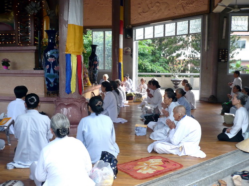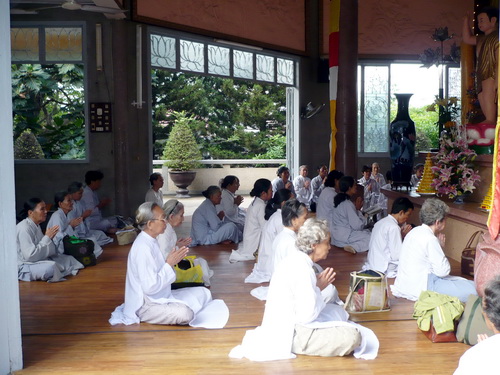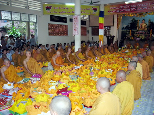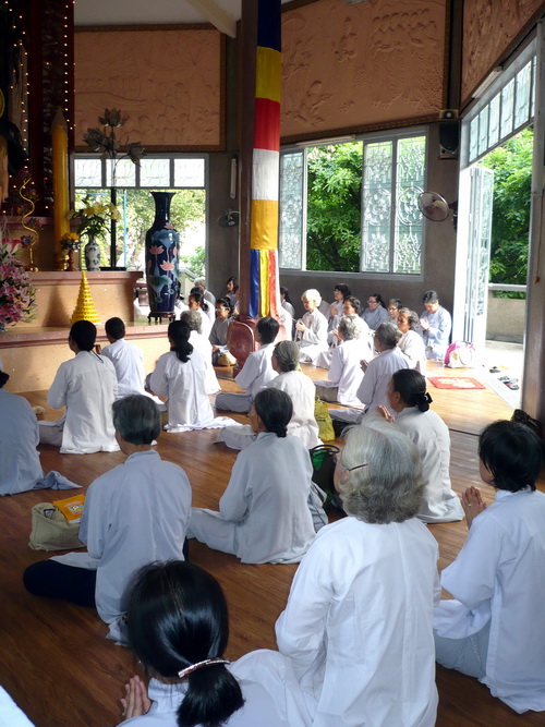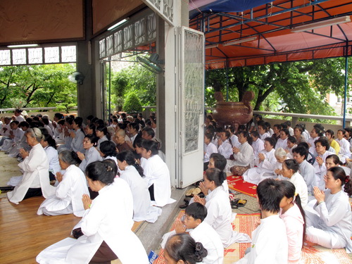 Phật tử ngồi xung quanh nghe pháp âm Vu-lan