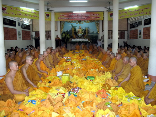 Các mâm y xếp hình hoa sen đã được dâng lên cúng dường hiện tiền Tăng bảo