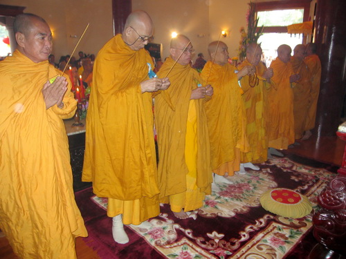 Chư tôn hòa thượng Giác Chân, hòa thượng Giác Phúc, hòa thượng Giác Lượng, hòa thượng Giác Nhiên, hòa thượng Giác Ngộ, hòa thượng Giác Dũng, hòa thượng Giác Thường và đại chúng đang dâng hương