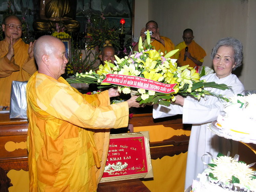 Đại diện Phật tử tặng hoa và quà chúc mừng Hòa thượng